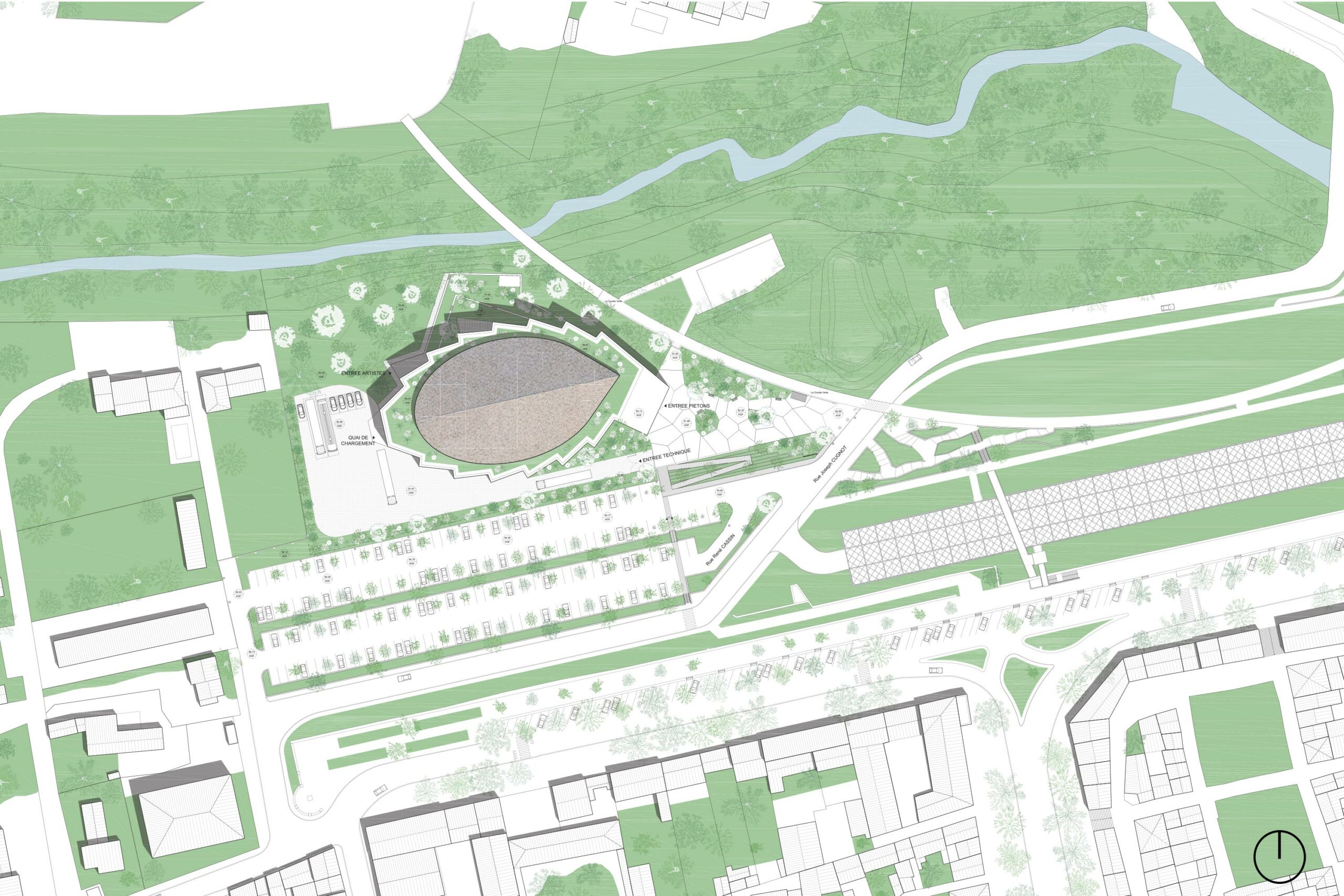 Le plan s’infléchit pour s’ouvrir vers le parvis par un large porche qui abrite la billetterie et les entrées dans le hall. L’ensemble est dense et efficace, et le bâtiment surgit de l’écrin de verdure formé par le boisement luxuriant et frais des bords de l’Auzon, qui sera étendu.