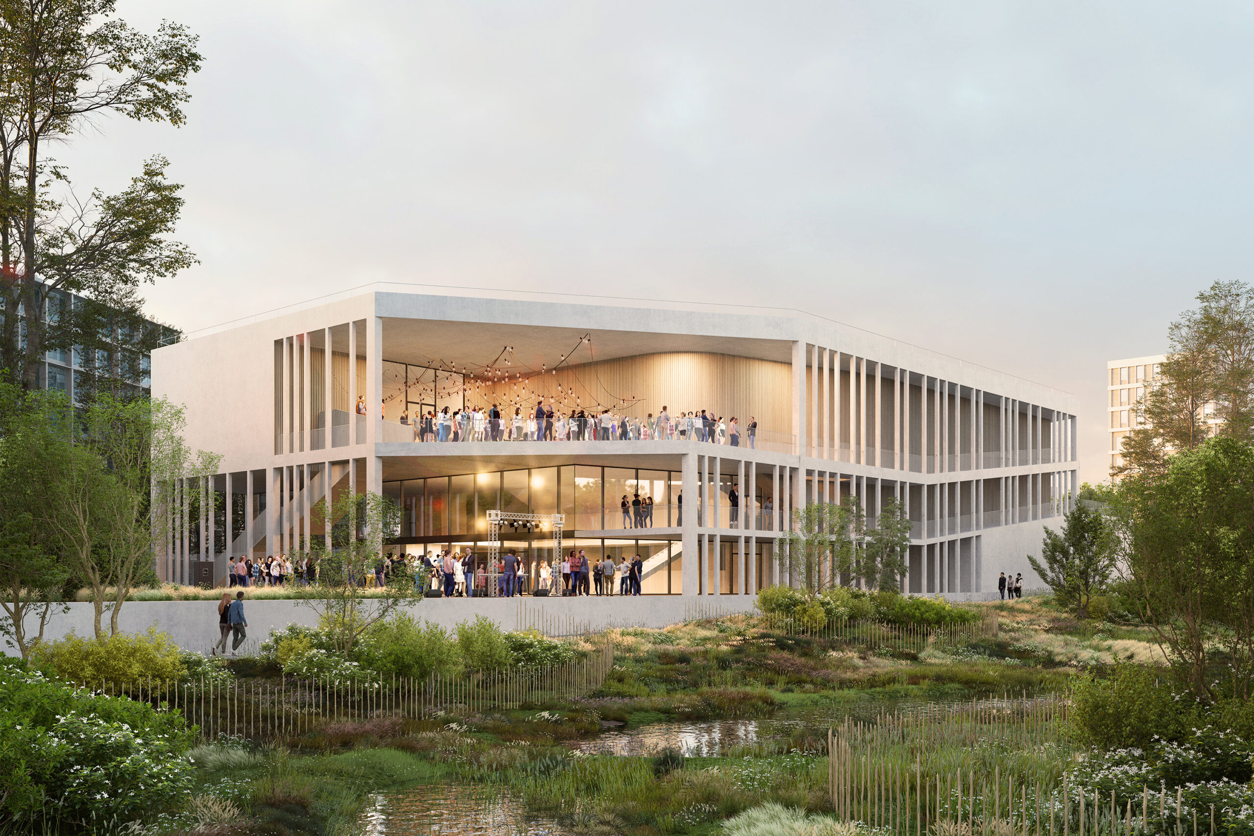 Notre projet est un volume sculptural et ouvert, un pavillon qui semble prolonger le parc mais aussi un édifice structurant du nouveau quartier. Il est travaillé comme une topographie, c’est un volume qui se parcourt horizontalement et verticalement à l’intérieur comme à l’extérieur. Par des jeux de creusements et de décalages, chaque entité programmatique est prolongée par une terrasse bien orientée et ouvrant sur le parc.