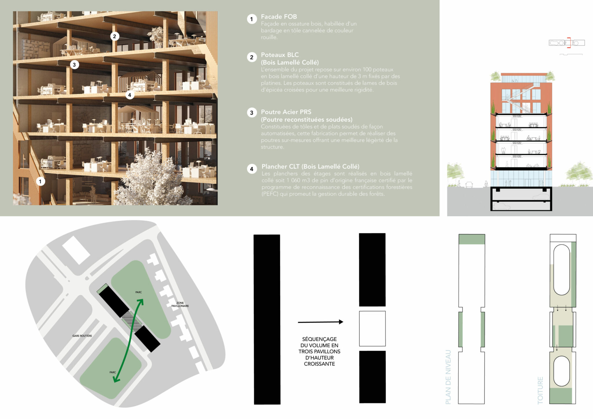 La structure du bâtiment est majoritairement en bois à partir du premier étage, elle se compose de poteaux en bois, poutres métalliques tous les 5.4m et planchers CLT. Les poutres en acier permettent de réduire le nombre de poteaux. Les cages d’escalier et d’ascenseurs sont en béton et assurent le contreventement. Les façades sont en ossature bois, elles sont entièrement préfabriquées et montées sur le chantier par modules de 2.7m.
