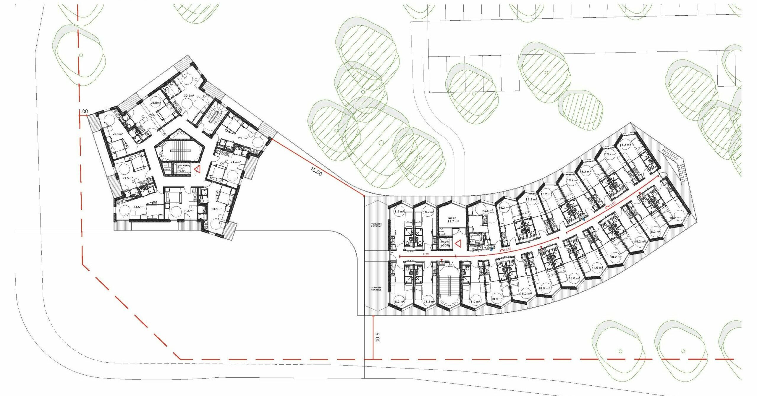 En contrepoint la Résidence Etudiante est un bâtiment plus bas, de 6 étages sur RDC, il émerge au-dessus de la canopée. Son tracé commence parallèlement au boulevard Becquerel, il participe au cadrage de la future place des totems avant de s’insérer par une courbe au sein du parc, entre les arbres. Les lignes horizontales des balcons, rythmés par l’alternance de parties en barreaudage bois et de panneaux béton, soulignent la fluidité de la courbe et laissent apparaître en deuxième plan la façade plissée des studios. Côté parvis des terrasses privatives, rattachées aux studios d’angle un étage sur deux, descendent en gradins vers l’ouest. Des espaces communs sont positionnés à chaque étage afin de favoriser l’échange et le vivre-ensemble.