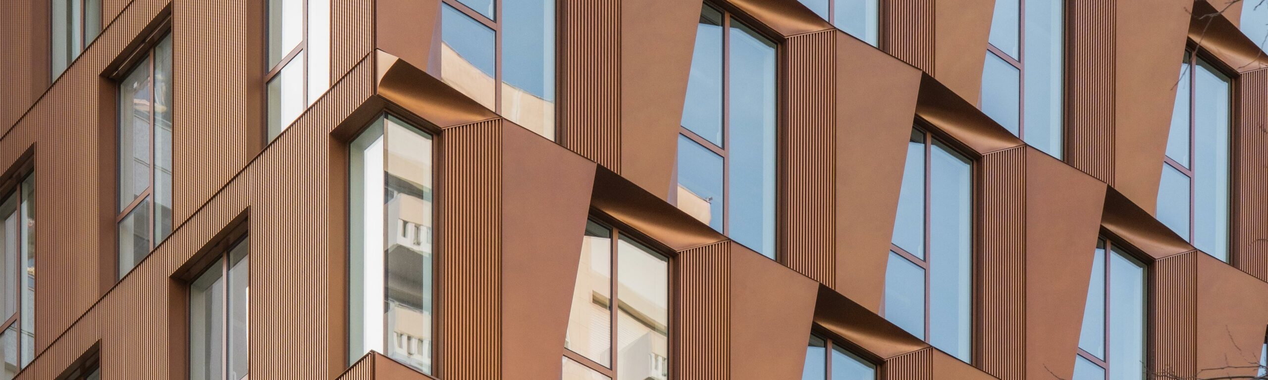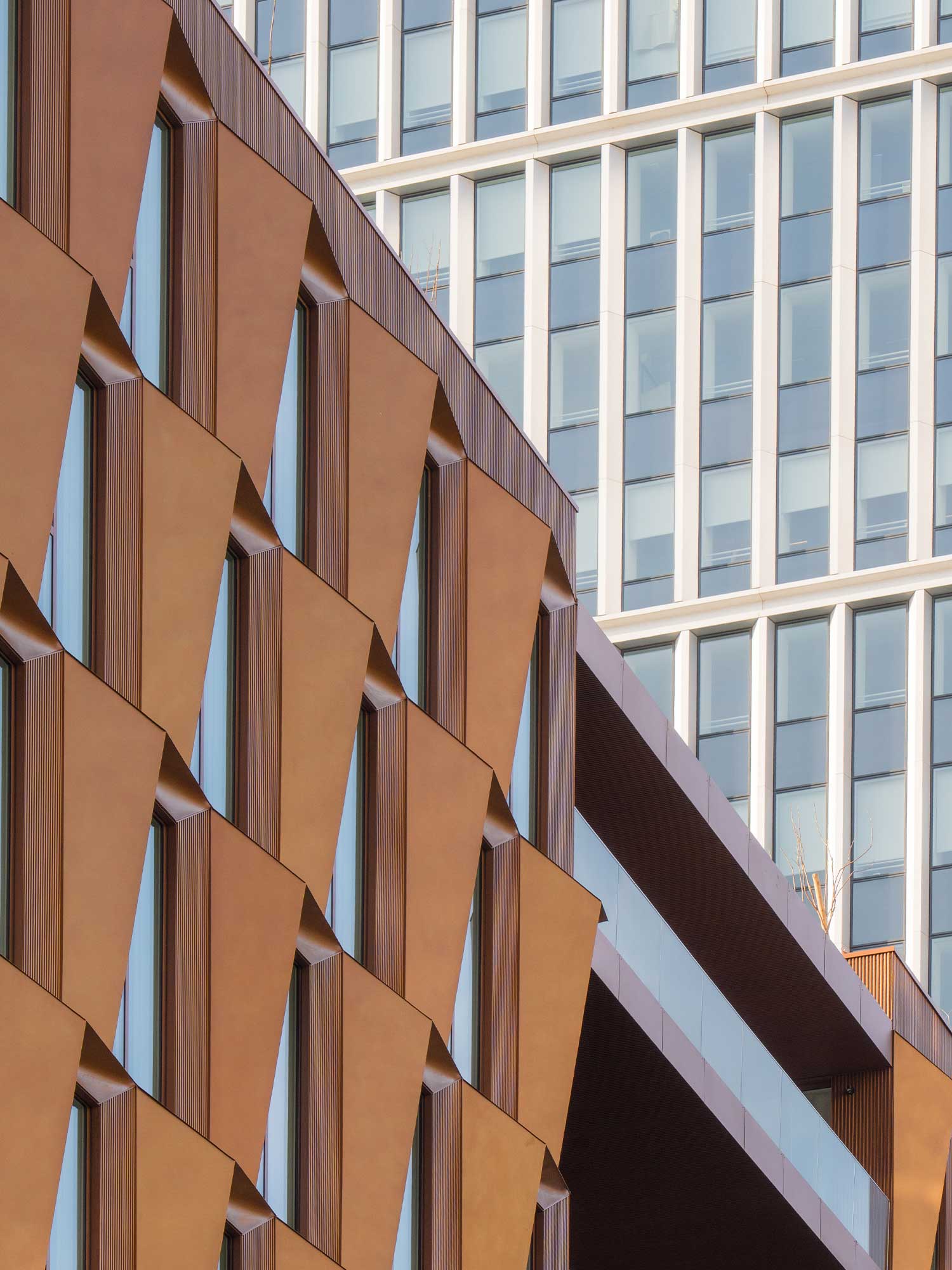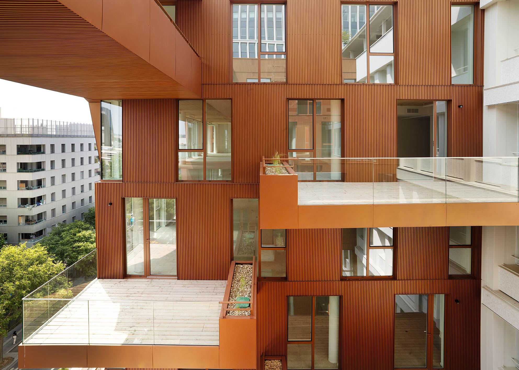 La couleur des façades des parties nouvelles, en métal cuivré, vient en contraste du blanc des façades réhabilitées des immeubles existants.