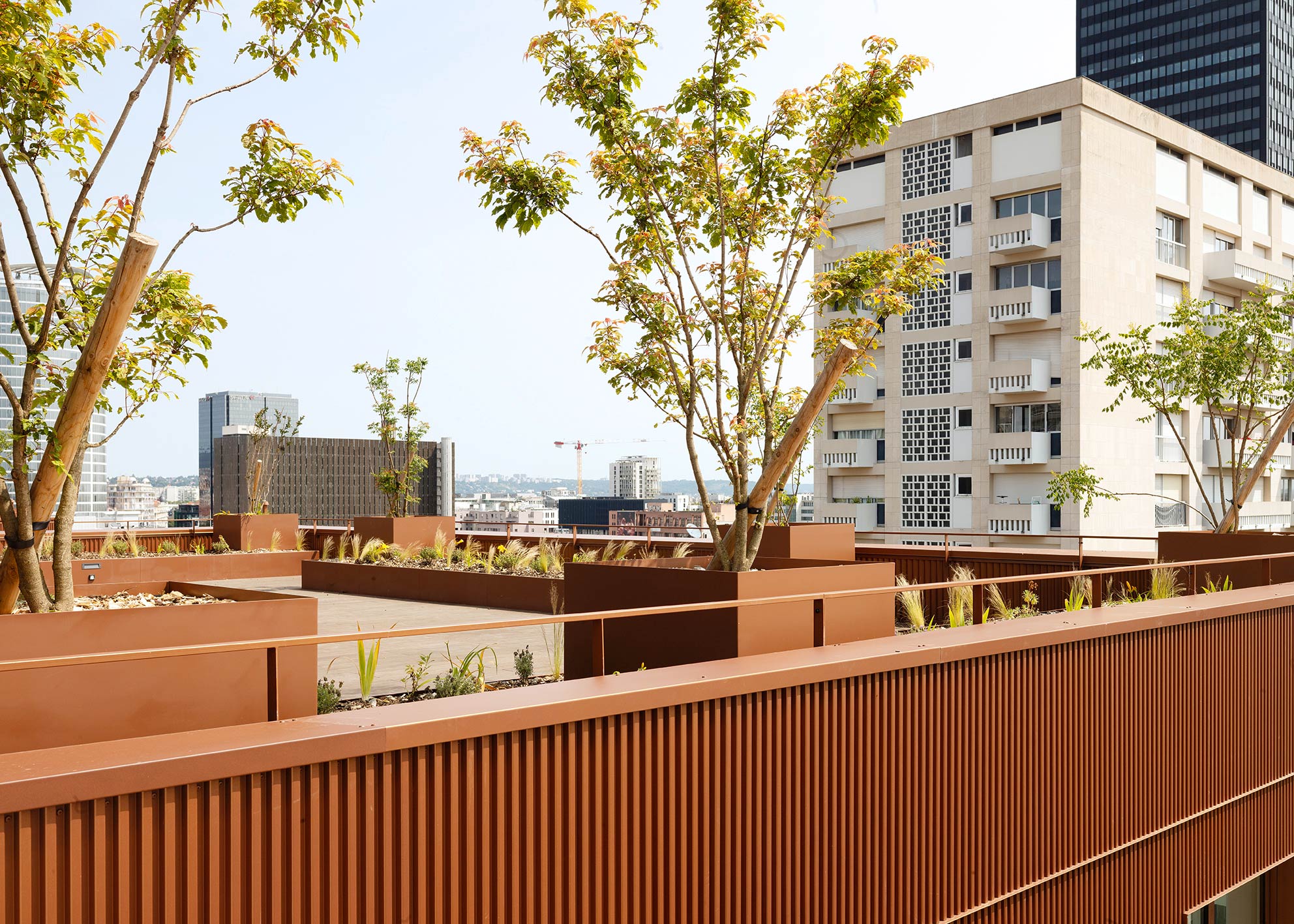 Toutes les toitures, existantes et nouvelles, sont converties en terrasses et jardins. L’espace entre les deux volumes de bureaux en extension sont investis par de larges terrasses-ponts qui traversent le vide, pour offrir des prolongements extérieurs à chaque étage.